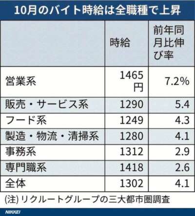 記事の内容としては、リクルートグループが「三大都市圏における10月のアルバイト・パート募集時の平均時給」を発表し、三大都市圏(首都圏、東海、関西)の前年の10月と比較すると51円(4.1%)高い1302円で、初めて1300円を超え、過去最高を更新したようです。